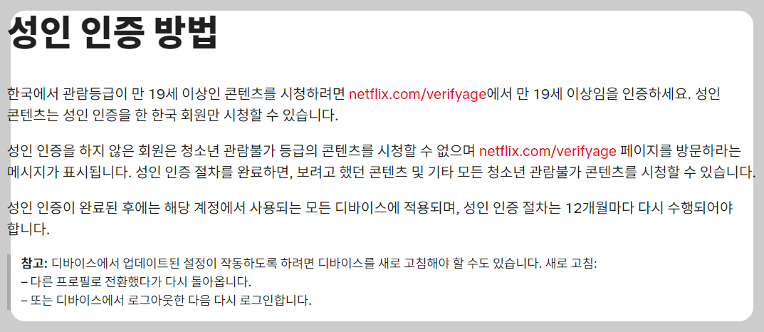 단, 1년(12개월)이 지나면 넷플릭스 보안 정책에 따라 재인증을 진행해야 하며, 재인증을 하지 않을 경우 성인 콘텐츠 접근이 차단됩니다. 만약 성인 콘텐츠가 갑자기 차단되었다면 1년이 지나 재인증 시기가 되었는지 확인해 주세요.