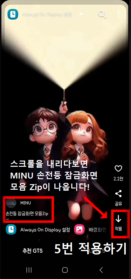 한 번만 따라 해보세요. 움직이는 캐릭터 7종이 손전등을 비춰주는 귀여운 배경화면, 누구나 설정할 수 있습니다.