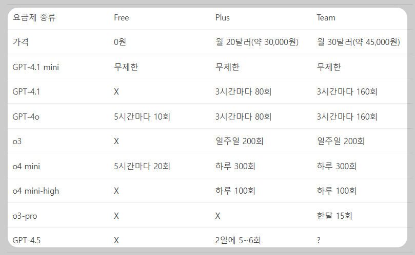 📢정리하면, 개인 사용자는 Plus만으로도 충분하고, 협업이나 공동 콘텐츠 제작을 자주 한다면 Team 요금제가 더 유리합니다. Enterprise는 대규모 조직에서만 실제적으로 활용됩니다. 참고로 무료 요금제에서는 GPT-3.5만 사용할 수 있으며, 속도나 정확도, 멀티모달 기능 등이 제한되기 때문에 본격적인 업무용으로는 부족할 수 있습니다.