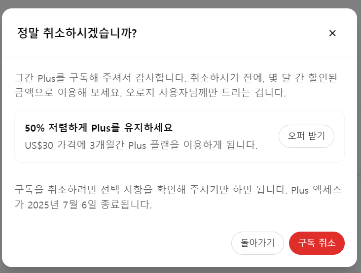 실제로 제가 2025년 6월 기준으로 구독 취소를 시도했을 때 “3개월간 50% 할인으로 유지해보세요”라는 팝업이 떴고, 오퍼받기 버튼을 누르니 바로 할인 적용 결제 창으로 넘어갔습니다.